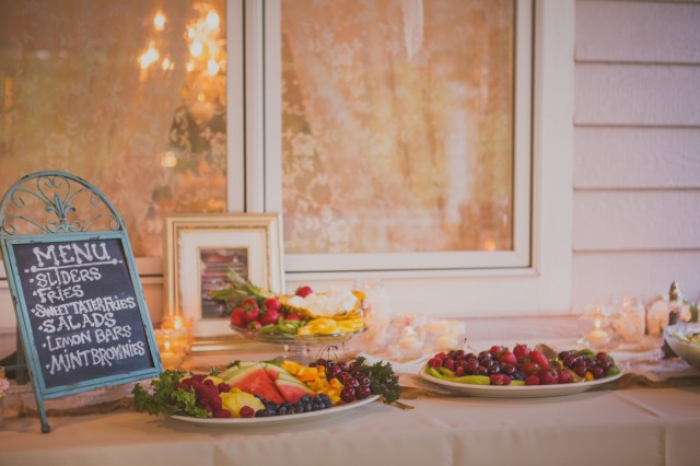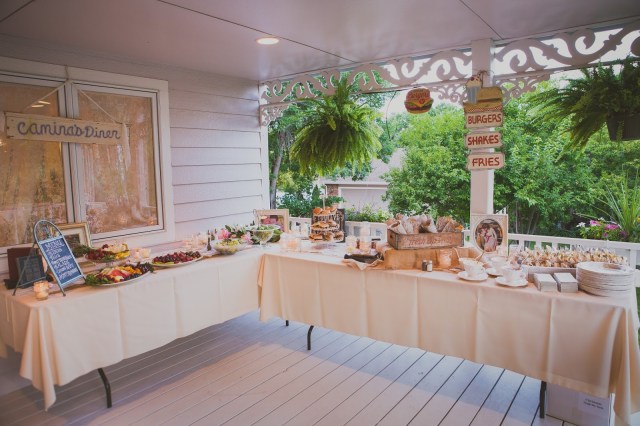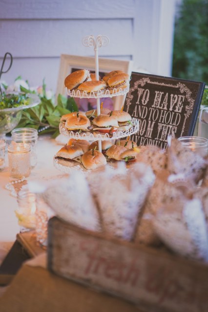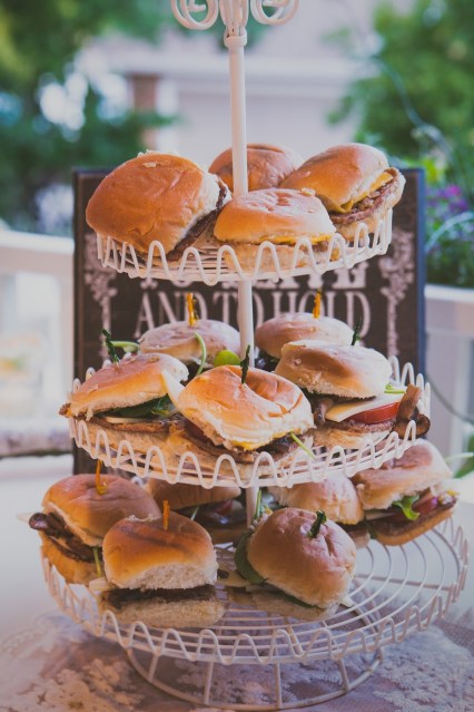 For this wedding, the bride and groom wanted to through in some Retro 1950’s spirit but when you say your serving hamburgers, it can be hard to maintain the classy element! So we served mini sliders and stacked them up on a cupcake tiered platter to showcase their cuteness. Yes, I just called a hamburger cute, but in this case, I think that have a fun color and it should be showcased. The sliders were held together with toothpicks to avoid a mess.
