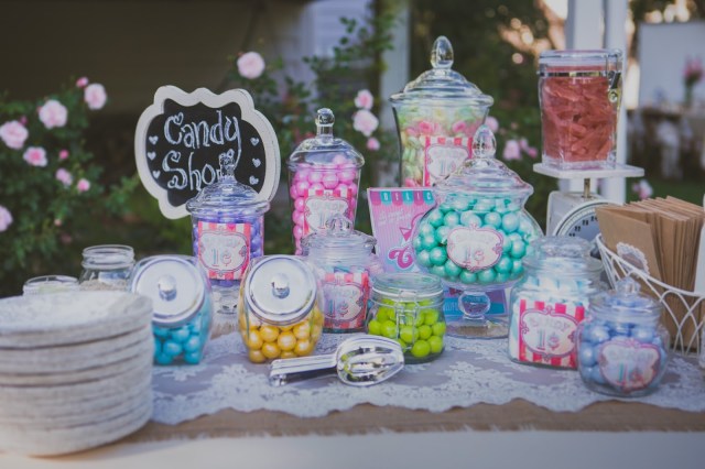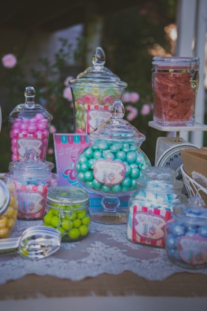 I don’t think this one ever gets old because it is so fun and so cute! Instead of making a strenuous effort to create many a wedding favor for every guest, I love that they can create something for themselves and the kids LOVE it. The cutest approach to this is to be sure to mix it up. Use a variety of funky shapes and sizes with a few lids and cute candy styled scoops. For this display we printed out vintage candy labels that had that carnival feel to them and then modged podged them to the jars. In our case, when modge podging the printed pieces, the ink would spread a bit, so it ended up looking that much older and more authentic as a vintage prop,