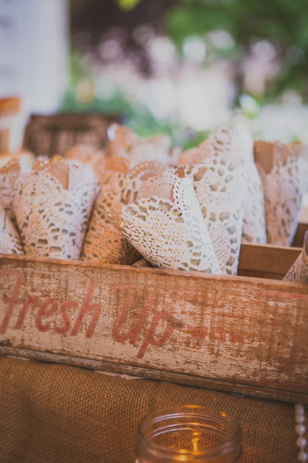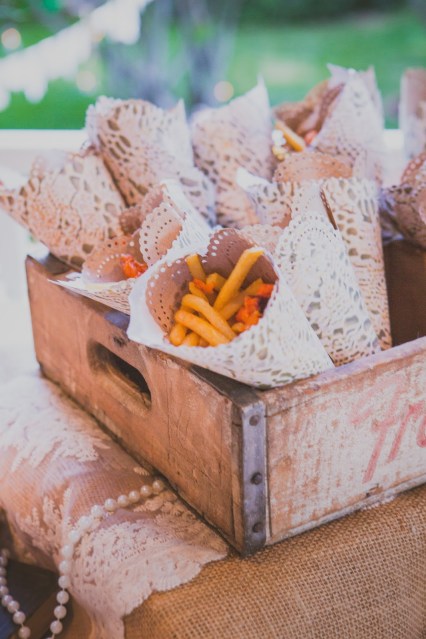 We created these with a waxed brown parchment paper and paper doilie patterned printed paper. We rolled them and then simply stapled them at the bottom. They were a fun way to display potato fries that were quick and easy for guests to grab. The box they are in is a vintage glass bottle box we found at a local antique mall.