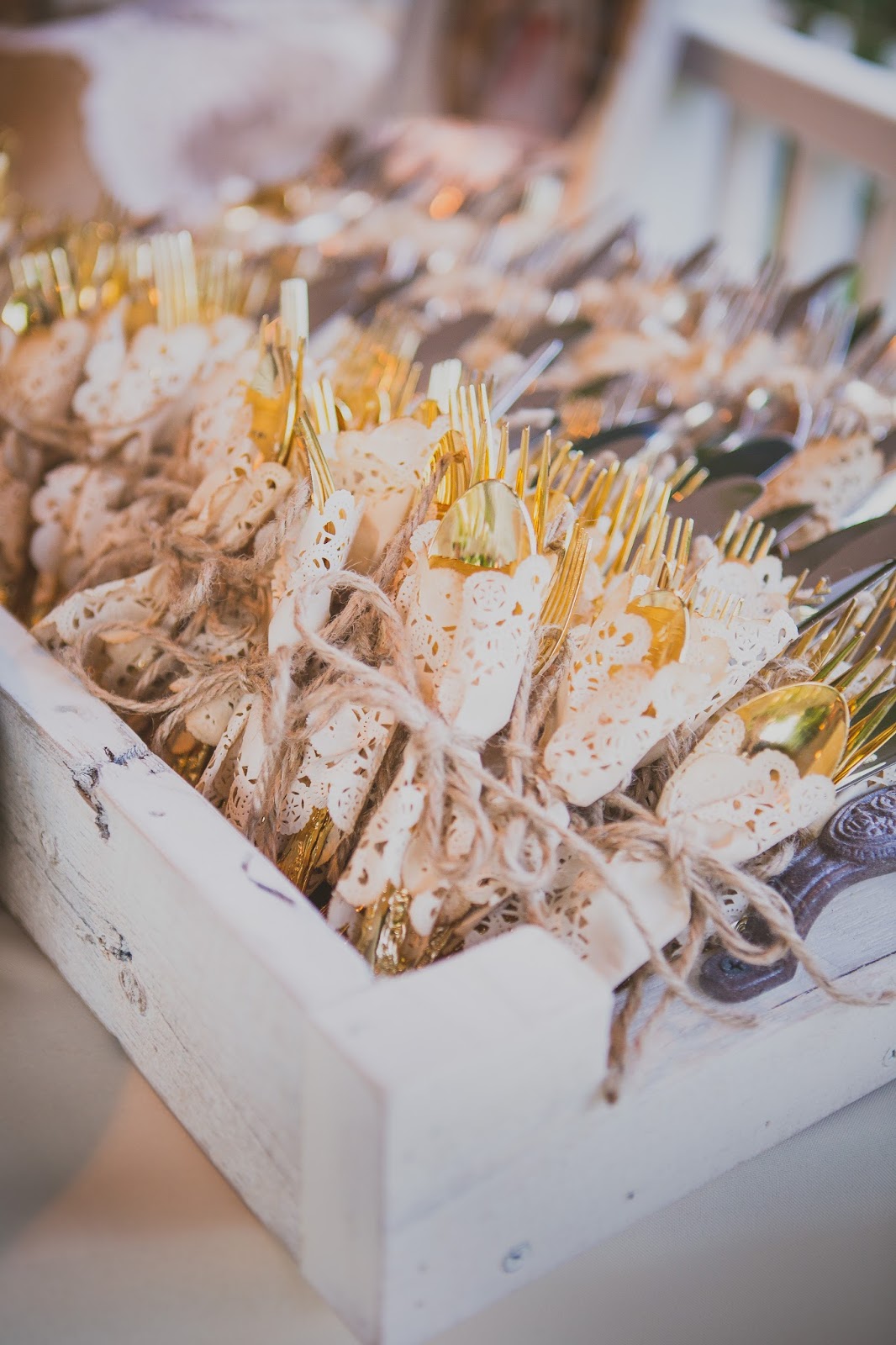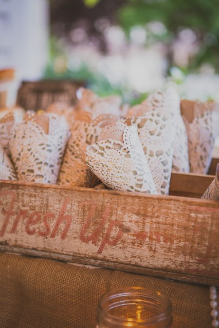 To step above plastic wears, we collected silverware and wrapped it in dollies with hemp twine. The doilies were also tinted with tea water and dried, but you can buy tinted paper doilies at Hobby Lobby or Michael’s which is much easier.