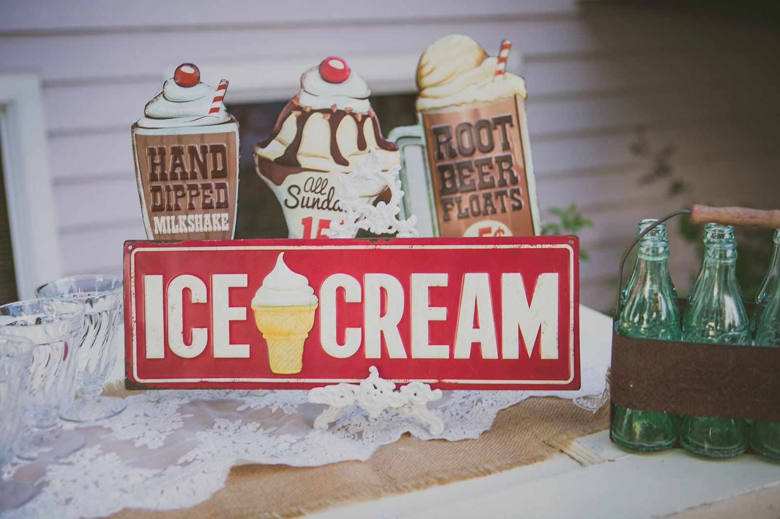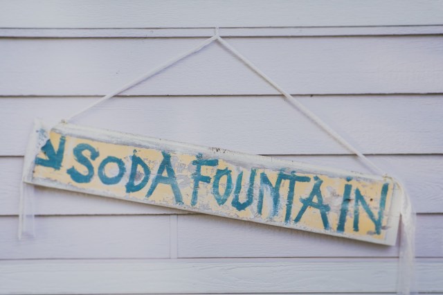 Soda Fountain sign hung with lace.