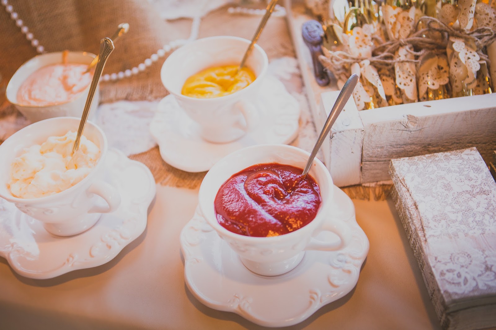 Since we mixed an all over retro and vintage theme, we used little traditional tea cups with gold spoons to dress up the sauces like ketchup, mayo and mustard. This can of course be applied to any sauce.