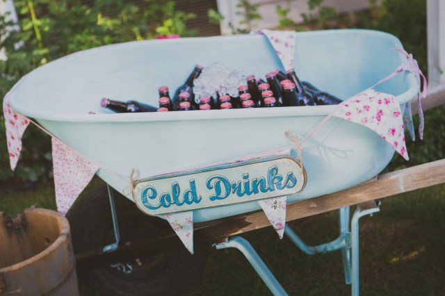 An old wheelbarrow, repainted it light blue and filled with it ice and a little garland to decorate it up! Super cute way to have soda pops ready for grabbing.