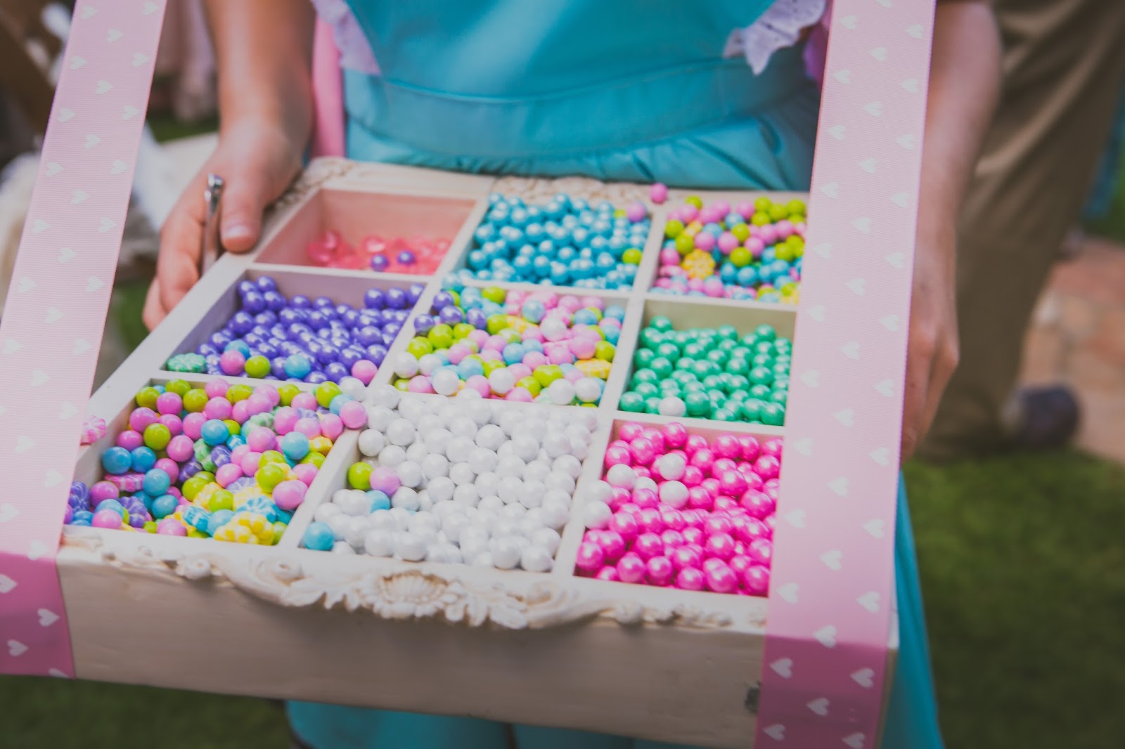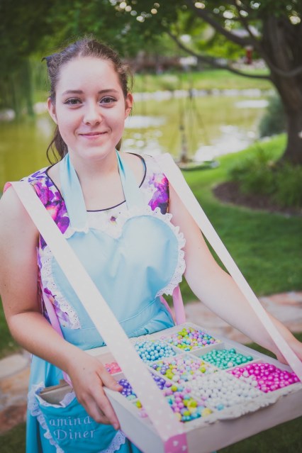 Bring the candy to the guests. Arrange to have teenagers dress up and serve candy to guests bringing the fun to them. For these we found a sectioned box at an antique mall and attached thick ribbon to it that could help support the box on the servers shoulders. Servers can share candy, cotton candy, popcorn, soda pops, favors etc. The list is endless.
